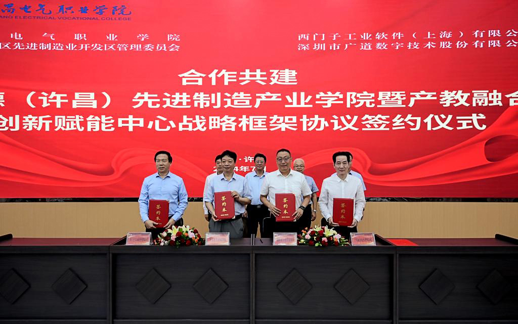 7月19日,许昌市魏都区先进制造业开发区管委会、许昌电气职业学院、西门子工业软件(上海)有限公司和深圳市广道数字技术股份有限公司四方汇聚一堂,共同签署了合作共建“中德(许昌)先进制造产业学院暨产教融合创新赋能中心”的协议。